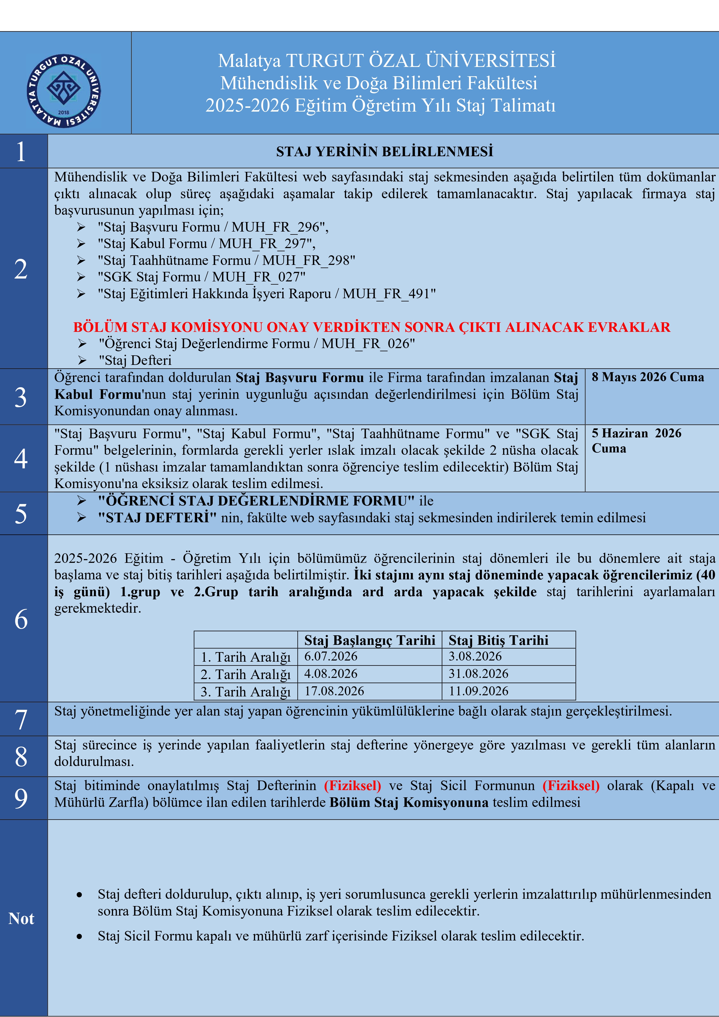 2025-2026 Eğitim-Öğretim yılı yaz dönemi staj tarihlerimiz ve staj sürecinde takip edilmesi gereken adımlar ilgili görselde belirtilmiştir. Staj yapacak öğrencilerimizin takvime ve kurallara titizlikle uyması gerekmektedir.