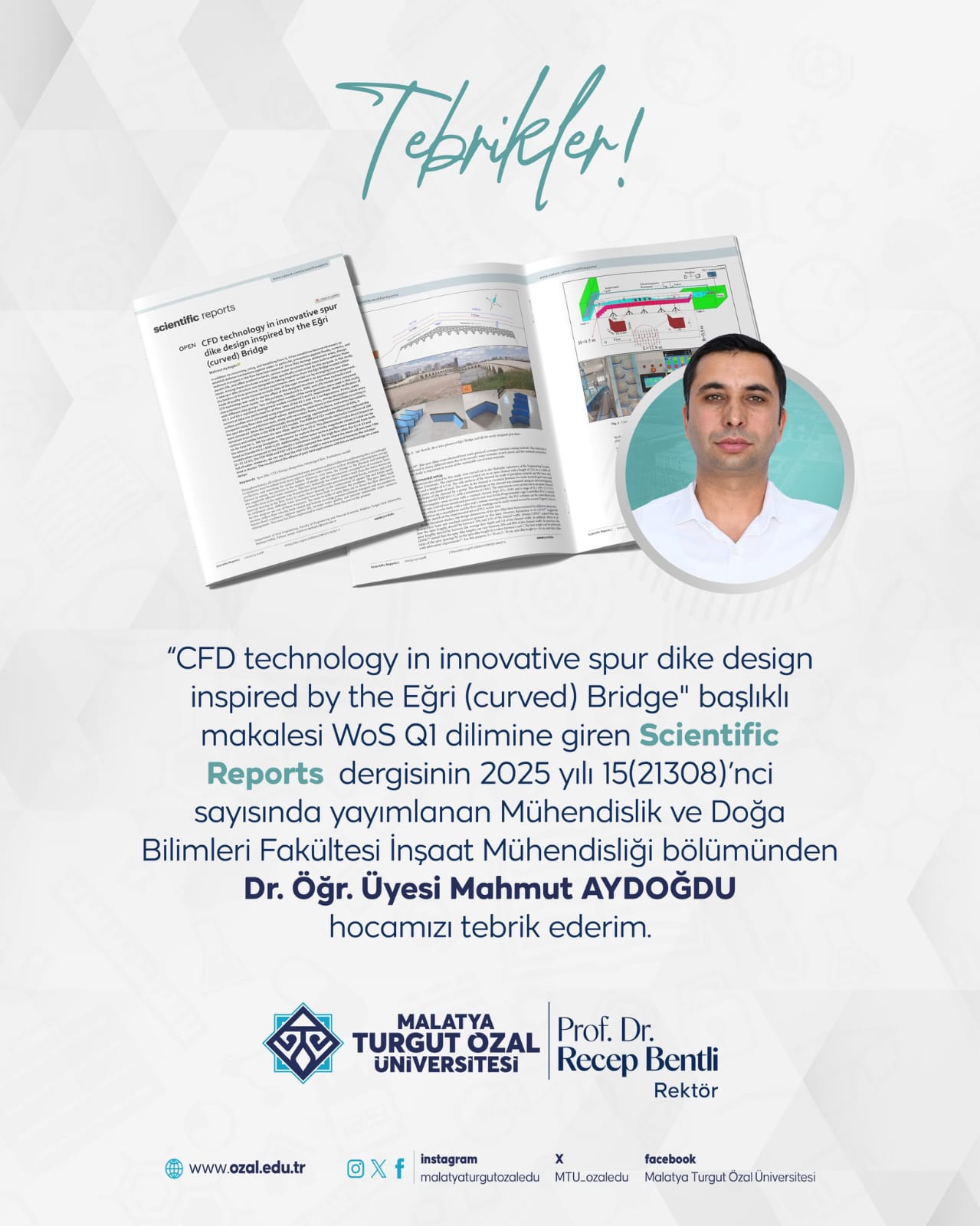 Bölümümüz Öğretim Üyelerinden Dr. Öğr. Üyesi Mahmut AYDOĞDU "CFD technology in innovative spur dike desing inspired by the Eğri(curved) Bridge " başlıklı çalışmsı WOS Q1 dilimine giren dergide yayımlanmıştır. Hocamızı tebrik eder, başarılarının devamını dileriz.