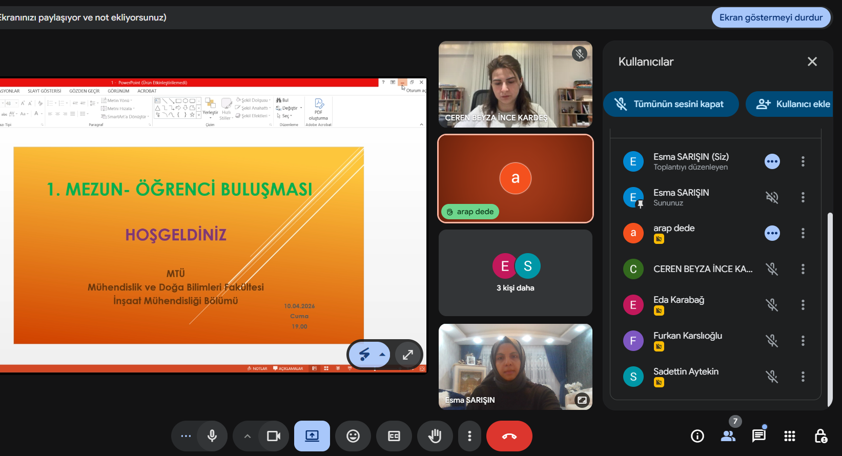 10.04.2026 tarihinde mezun öğrencilerimiz, aktif olarak eğitim-öğretim gören öğrencilerimiz ve akademik personelimiz bir araya gelerek mezun-öğrenci etkinliği gerçekleştirilmiştir. Etkinlik kapsamında mesleki alanda tecrübeler, merak edilenler ve iş hayatı koşulları vs. konuları ele alndı.